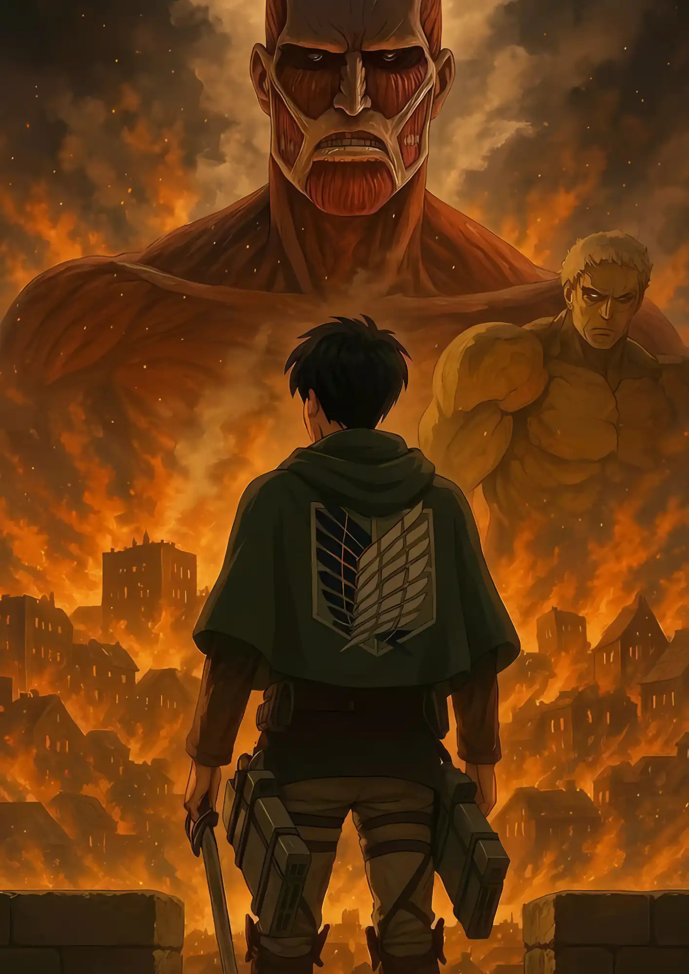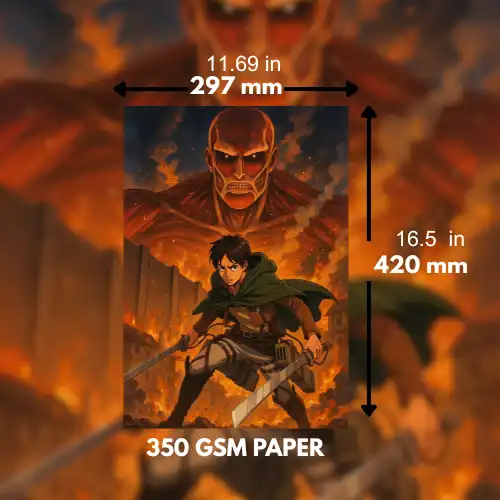 Experience the overwhelming tension as Eren confronts both the Colossal and Armored Titans in this high-stakes A3 size premium poster. Perfect for Attack on Titan fans who love the action-packed moments of the series. Printed on 350 GSM premium paper, it brings every fiery detail and dramatic moment to life.