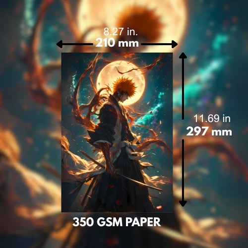 Bring the power of Ichigo Kurosaki from Bleach into your space with this A4-size poster (21 x 29.7 cm)! This dynamic artwork shows Ichigo wielding his sword in a fierce battle stance, exuding raw power. Printed on high-quality 350 GSM paper, this poster guarantees long-lasting colors and vivid details, perfect for Bleach fans