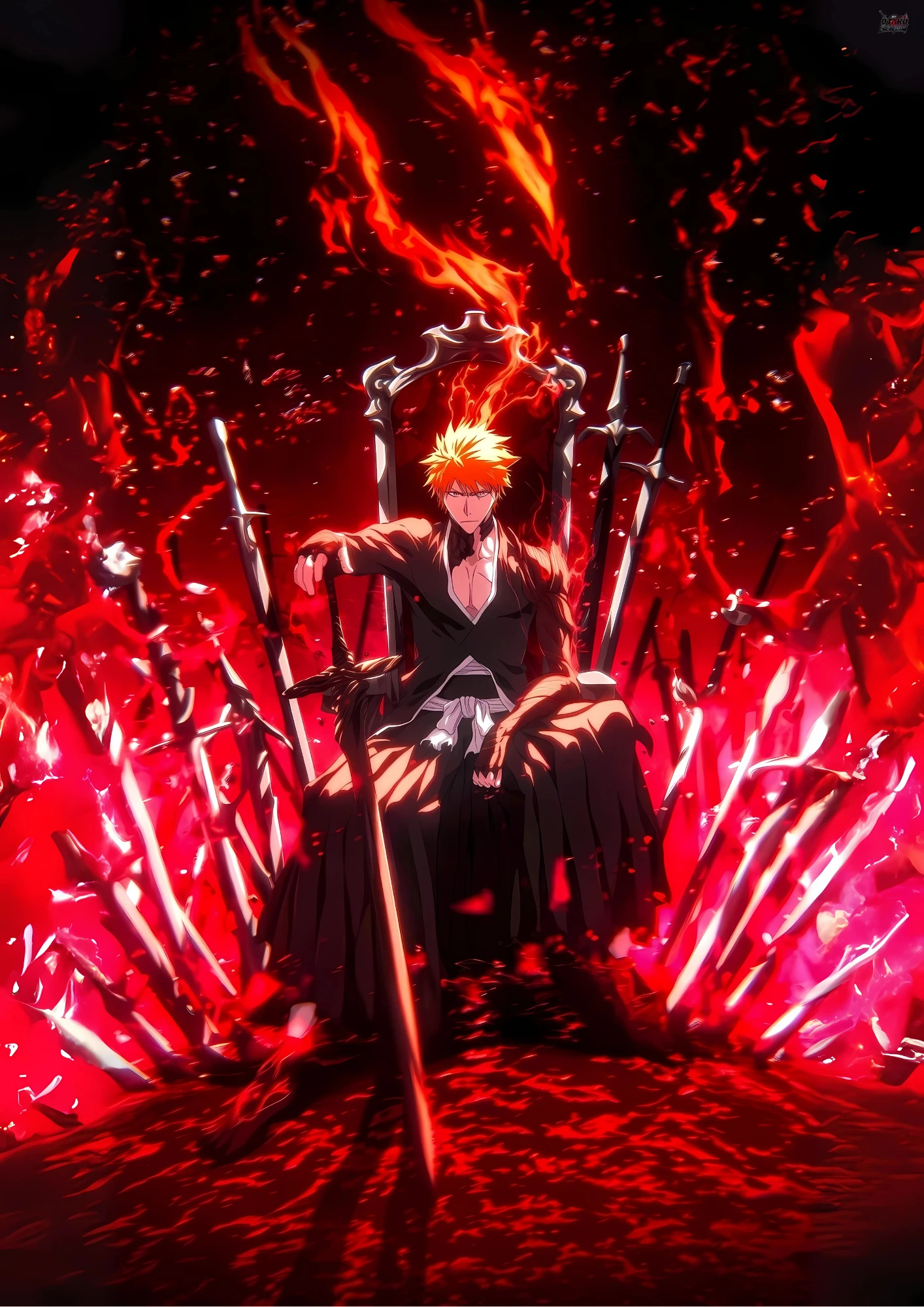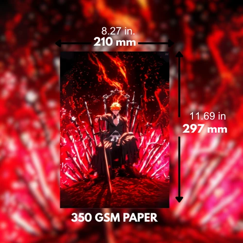 Feel the intensity of Ichigo Kurosaki with this A4-size poster (21 x 29.7 cm) from Bleach! Depicting Ichigo sitting on a throne made of swords, this powerful scene showcases his strong presence and unyielding spirit. Printed on premium 350 GSM paper, this poster delivers rich colors and intricate details, a must-have for any Bleach fan