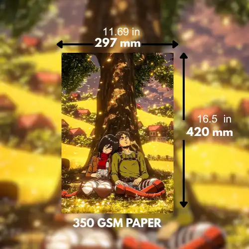 Capture the serene moment of Mikasa and Eren resting under a large tree in this A3 size premium poster. A beautiful depiction of calm amidst the chaos, perfect for fans of Attack on Titan looking for a quieter, reflective piece. Printed on high-quality 350 GSM paper, it offers detailed artwork and vibrant colors. Ideal for framing or direct hanging.
