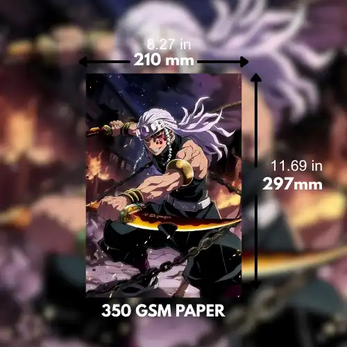 Add a burst of color and flamboyance to your space with Tengen Uzui from Demon Slayer: Kimetsu no Yaiba. This premium A4 size poster captures the Sound Hashira’s striking headband, dual Nichirin swords, and confident battle stance. Perfect for fans who love his over-the-top personality and unmatched style. Printed on high-quality, fade-resistant paper, it’s ideal for long-lasting display in your anime collection or room decor.